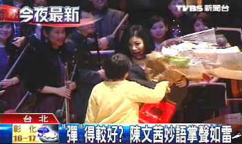 據(jù)臺灣TVBS報道,民樂團奏出西方《歌劇魅影》里的歌曲,別有一番風(fēng)味,但仔細瞧,彈鋼琴的不是名嘴陳文茜嗎?再一首《月亮代表我的心》,短短不到十分鐘的表演,搶盡整場鋒頭。