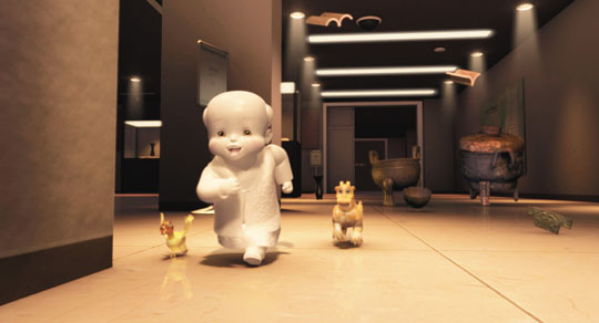 《國寶總動員》是臺北“故宮”近來推動創(chuàng)新精神的杰作,以兩三年的時間發(fā)展、完成創(chuàng)作。影片中以“國寶級”文物:嬰兒枕、玉辟邪、玉鴨為主角,尋找從翠玉白菜上飛走的螽斯,在夜半大鬧“故宮”,并在冒險歷程中逐一結(jié)識五十件“故宮”明星文物。