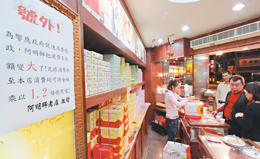 中新網(wǎng)11月19日電 據(jù)臺灣《聯(lián)合報》報道,為刺激消費,臺當(dāng)局將發(fā)放每人三千六百元(新臺幣,下同)的消費券,迎接高達(dá)八百五十億元的消費券商機(jī),包括零售、超商、量販、餐飲等業(yè)者樂翻了,都把消費券視為今年和明年的營銷重點,紛紛摩拳擦掌規(guī)劃各種促銷方案。
