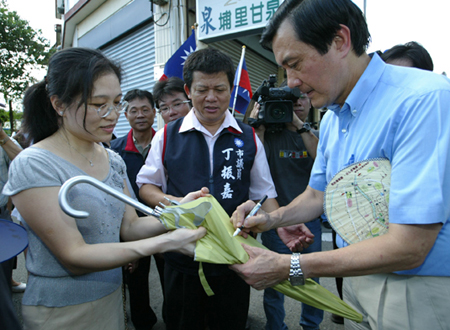 國(guó)民黨2008年“大選”參選人馬英九拜訪基層,熱情民眾拿出雨傘要求簽名,傘尖卻差點(diǎn)戳到小馬哥的“重要部位”,留下這一幅尷尬畫面。記者丁志寬/攝影