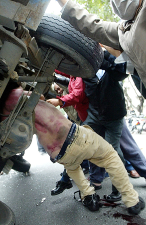 臺灣當(dāng)局強(qiáng)拆“大中至正”匾額爆發(fā)流血事件,民眾彭盛露涉嫌駕駛小貨車瘋狂加速撞上東森攝影記者王瑞璋,王送醫(yī)急救后傷勢漸穩(wěn)定,目前努力復(fù)建中。記者侯世駿/攝影
