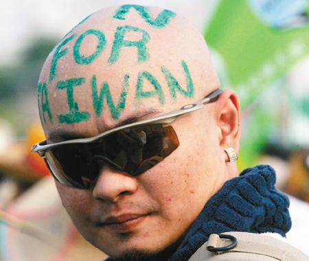 民進(jìn)黨宣傳“入聯(lián)”絞盡腦汁,小到郵戳,大到101大樓,都有UN FOR TAIWAN。圖為民進(jìn)黨高雄市“入聯(lián)”游行,一名綠營支持者剃光頭寫上英文。記者劉學(xué)圣/攝影
