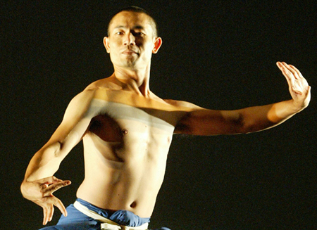 《男人跳舞》登上臺北舞臺,從父親的關(guān)系、女性特質(zhì)、暴力、變身及性別等主題出發(fā),剖析多變與復(fù)雜的男性認同議題。圖為獨舞的泰國古典面具舞者皮歇•克朗淳。記者林秀明/攝影