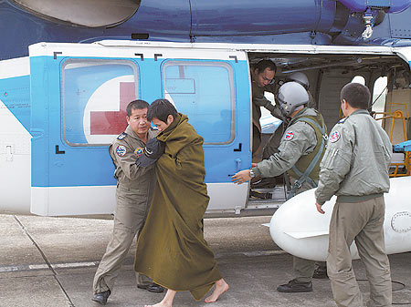 臺(tái)灣方面動(dòng)用直升機(jī)將大陸船員平安救抵機(jī)場(chǎng)。圖:臺(tái)灣《中國(guó)時(shí)報(bào)》