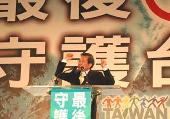 民進黨候選人謝長廷20日出席“最后一席、守護臺灣”晚會,強調未來的命運交給大家,如果沒當選也絕不落跑,會守護臺灣。 “中央社”圖