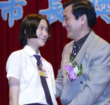 2001年,時為臺北市長的馬英九頒發(fā)市長獎給各“國中”優(yōu)秀畢業(yè)生,當頒發(fā)給自己的小女兒馬元中時樂得將他拉進自己的懷里擁抱,但馬元中顯得羞澀不自然,甚至白了父親一眼。(臺灣聯(lián)合新聞網(wǎng)圖;潘俊宏/攝影)