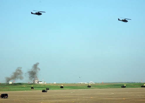 臺(tái)軍第五作戰(zhàn)區(qū)“漢光24號(hào)”演習(xí),23日在臺(tái)中清泉崗空軍基地舉行空降暨反空降演練。圖為反空降掃蕩部隊(duì)在攻擊直升機(jī)火力支持下,防衛(wèi)軍發(fā)起沖鋒攻擊。(“中央社”圖)