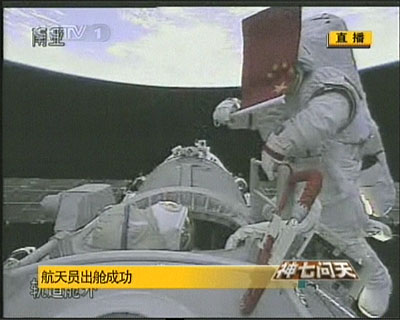 臺灣東森新聞報道說,神舟七號航天員翟志剛于下午順利在太空中邁出第一步。穿著中國研發(fā)制造總重120公斤,造價3000萬人民幣宇宙飛行服的他,以頭先腳后的方式進入太空,白色宇宙飛行服上鮮艷的五星紅旗顯得格外醒目。