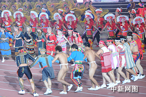 中新網(wǎng)泉州10月26日電 第六屆農(nóng)民運(yùn)動(dòng)會(huì)今晚在福建省泉州市隆重開(kāi)幕。圖為臺(tái)灣泰雅族、阿美族在開(kāi)幕式上表演的“豐年祭”精彩舞蹈。