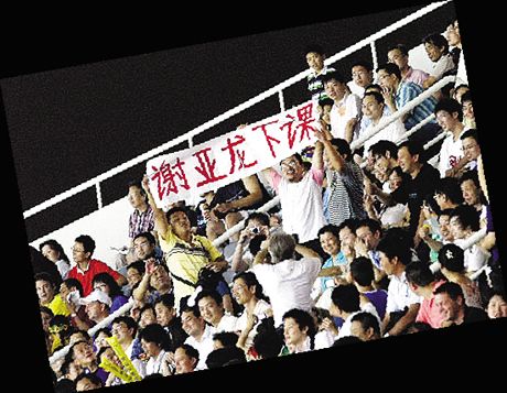謝亞龍作為中國(guó)足協(xié)的一把手,在其任期內(nèi)也是語(yǔ)錄翻新不斷,從亞洲兵敗的吟詩(shī):“恨不抗日死,留作今日羞。國(guó)破尚如此,我何惜此頭”到女足奧運(yùn)無(wú)緣四強(qiáng)之后說(shuō):“女足該練練叉腰肌。”不過(guò),語(yǔ)錄再多也不能當(dāng)球踢,國(guó)足和國(guó)奧糟糕的戰(zhàn)績(jī)讓中國(guó)球迷們?nèi)虩o(wú)可忍,在很多地方打出了“謝亞龍下課”的標(biāo)語(yǔ),而在北京奧運(yùn)會(huì)期間,這句話更取代了“加油”的助威聲。
