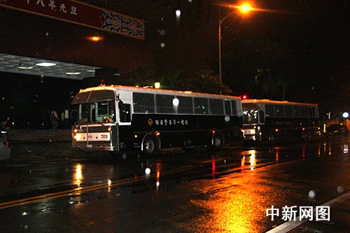 圖為3時(shí)30分,臺北地方法院的警備車載著陳水扁離開臺北地院,前往臺北看守所后。臺北地院恢復(fù)平靜。保安警察也收工 ,乘車離開。 (中新社記者 陳立宇/攝)