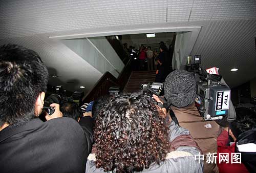 12月29日下午2時,臺北地方法院召開前臺灣地區(qū)領(lǐng)導(dǎo)人陳水扁羈押庭,經(jīng)過長達12多小時的庭訊、評議后,合議庭審判長蔡守訓(xùn)30日2時25分裁定將陳水扁羈押,但不禁見。圖為消息傳出后,臺北地方法院樓上樓下一陣騷動。 (中新社記者 陳立宇/攝)