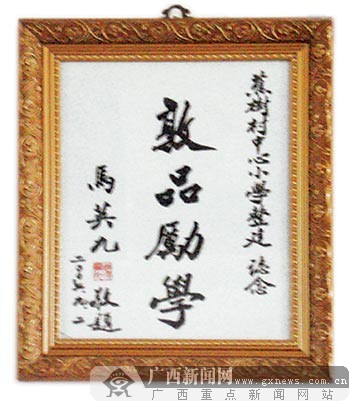 此后,謝先生先后5次將籌集的款項轉(zhuǎn)到謝桂林所提供的賬戶,共200多萬臺幣,折合人民幣75萬多元。2007年2月,謝先生轉(zhuǎn)給謝桂林一筆錢,并特別告訴他其中有5萬元臺幣是馬英九先生個人捐款。為此,該校在那年春節(jié)期間,還特別掛出橫幅“衷心感謝中國國民黨主席馬英九先生為我校建校捐款新臺幣5萬元”。昨日謝校長指著他辦公室掛的一幅字向記者介紹,2007年8月,謝先生特意請馬英九先生為該小學題字作為紀念,并以掛號信的方式寄過來。記者看到,上面寫著“敦品勵學”,左邊落款是“馬英九敬題 二00七年九月二日”。