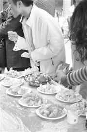 “棺材板,是什么東東,也能吃?”“啊,還有傳說中的臺灣水果啊。”臺灣美食的魅力果然不小,盡管下著小雨,不過話音才落,過往的廈大學(xué)子紛紛駐足,嘗嘗這餅,品品那糖,“味道還真不錯耶”。