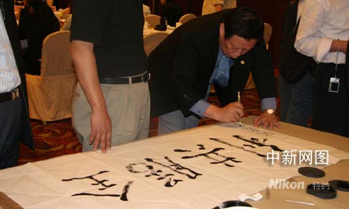 臺(tái)灣兵法專家傅慰孤親筆題詞“全勝共贏”遙祝兩岸和平。汪恩民 攝