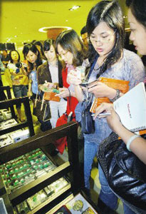 據(jù)悉,踩線團(tuán)成員中大約有四分之一到過臺(tái)灣。在參觀完臺(tái)北“故宮博物院”后,團(tuán)員們心情愉快,雖被媒體緊盯,仍不影響消費(fèi)力,采買許多“故宮”小飾品。其中,每個(gè)100元(新臺(tái)幣,下同)仿翠玉白菜吊飾和每個(gè)300元的頌壺耳環(huán),很多人一口氣就買五、六個(gè)翠玉白菜。
