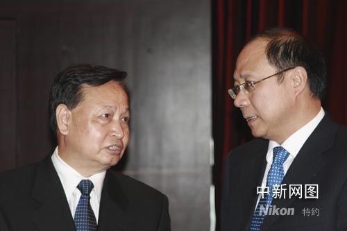 羅清泉(左)與國臺辦常務(wù)副主任鄭立中交談。張暢 攝
