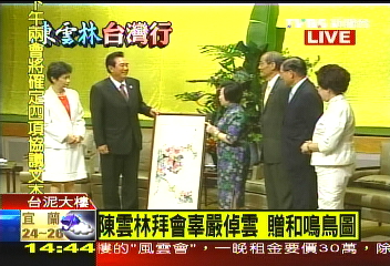 辜嚴倬云贈上張大千的名作“和鳴鳥圖”給陳云林,象征兩岸“合鳴”。 (來源:臺灣TVBS)