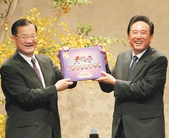 國民黨榮譽(yù)主席連戰(zhàn)(左)4日以晚宴款待海協(xié)會(huì)會(huì)長陳云林(右),并致贈(zèng)臺(tái)灣名產(chǎn)“鐵蛋”。(圖:臺(tái)灣《聯(lián)合報(bào)》)