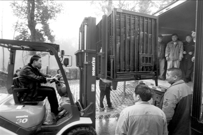工作人員利用叉車將“圓圓”平穩(wěn)送進專門設計的轉運車。王磊攝(圖片來源:京華時報)