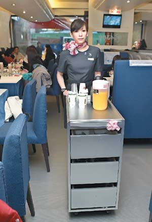 該餐廳的餐點(diǎn)除了推出真正的飛機(jī)餐外,另配合八種航線推出八國異國套餐。呂寶珍指出,為了進(jìn)一步展現(xiàn)機(jī)上情境,已著手規(guī)劃頭等艙專區(qū),未來將比照機(jī)上賣免稅品方式,由服務(wù)員推小推車促銷香水、吊飾等機(jī)上流行商品。