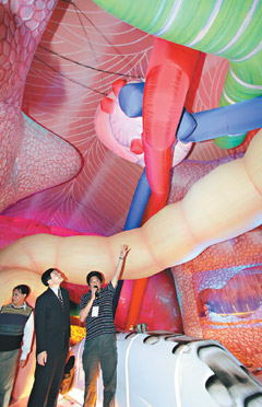 記者先走入“格列佛人體藝術(shù)探索館”一探究竟,從巨大的腳掌進(jìn)入,首先映入眼簾是大腿骨和腳掌骨,充滿普普藝術(shù)的彩繪風(fēng)格;創(chuàng)意團(tuán)隊將小腸化身為LED燈的迷宮隧道,還能看到跳動的心臟,利用氣球制造肺部呼吸頻率,栩栩如生。