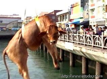 據(jù)悉,這頭大黃牛原本用船運輸,但在準備接駁到岸邊卡車上時,綁它的繩索突然斷掉,才造成這一起意外落海事件。消防隊員表示,這還是第一次接到“吊!钡娜蝿。