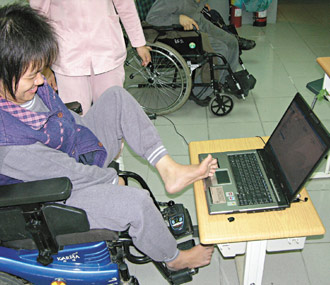 十八年前黃美秀讀埔里中學(xué)資源班,老師鼓勵(lì)她學(xué)電腦,六十六歲的祖母每晚陪她去上課,剛開(kāi)始練習(xí)用腳趾按鍵盤(pán)、撥動(dòng)鼠標(biāo),腳上好像綁著大石頭,苦練一星期后,熟練與靈活度已比“正!蓖瑢W(xué)還要好。現(xiàn)在她的黃金左腳,大小趾并用,一分鐘可輸入二十個(gè)字。