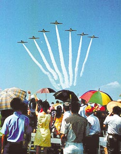 空軍雷虎小組也是遠(yuǎn)東地區(qū)第一支特技飛行小組,成立初期就以精湛技術(shù)揚名國際。1957年,在菲律賓航空周首開先例九機編隊表演;1959年赴美參加第一屆航空表演,以九架軍刀機做低空表演贏得贊譽。