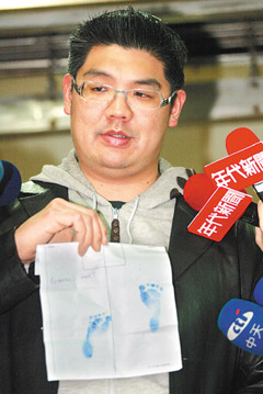 連勝文晚上九點(diǎn)向媒體展示寶貝兒子的腳丫印,他說,看到孩子出世的那一刻,雖然沒有掉淚,但還是相當(dāng)感動(dòng),看到孩子的第一眼,覺得孩子長得比較像媽媽,臉型俊秀;體型方面,從腳丫子判斷應(yīng)該是像爸爸,未來應(yīng)該也會(huì)相當(dāng)魁梧。