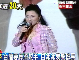 中新網3月2日電 據(jù)臺灣TVBS報道,國民黨二00八“大選”候選人馬英九,今天晚間在臺北縣舉辦造勢晚會,在這場晚會中,藝人白冰冰首度表態(tài)支持馬英九。