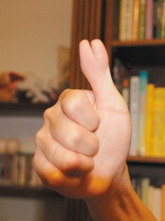陳姓男子說(shuō),“大選”情緊繃,藍(lán)、綠立場(chǎng)愈來(lái)愈鮮明,他的右手大拇指硬是比別人多出一個(gè)指頭,時(shí)機(jī)敏感,他自嘲處境尷尬,豎大拇指,泛綠朋友恐錯(cuò)當(dāng)他比V,平日跟支持馬蕭的友人在一起,比起大拇指,明明就是V,就是支持2號(hào)馬英九,但又怕支持泛藍(lán)的朋友誤會(huì)他比“1”,是挺綠的。
