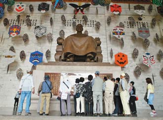 中新網(wǎng)3月27日電 國(guó)民黨贏(yíng)得臺(tái)灣地區(qū)領(lǐng)導(dǎo)人選舉。被臺(tái)當(dāng)局更名為“民主紀(jì)念館”的臺(tái)北中正紀(jì)念堂的蔣介石銅像也將“出關(guān)”。蔣銅像周?chē)鷴炱鸬娘L(fēng)箏、臉譜、拼板舟及綁著抗議頭帶的展示架,都將在3月31日閉館后拆除;4月1起,銅像大廳將恢復(fù)昔日的氣氛。