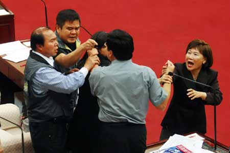 中新網4月9日電 據“中央社”報道,臺北市“議會”8日發(fā)生“議員”口角,市“議員”楊實秋(中背對鏡頭)認為鄰座的莊瑞雄(左二)干擾他發(fā)言,雙方爆發(fā)口角,眾“議員”紛紛趕來勸架,在“議長”宣布休息后才結束紛爭。