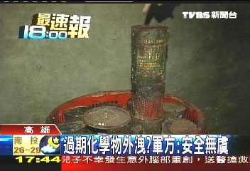 化學(xué)品上頭寫著DS2-消除劑,生產(chǎn)日期是1989年3月,有效期限只能到1992年3月,全是臺(tái)軍聯(lián)勤204廠所制造。制造方表示說(shuō):這些被棄過(guò)期化學(xué)品“對(duì)人體沒有影響,消除劑里頭有強(qiáng)堿,對(duì)環(huán)境會(huì)有疑慮,我們會(huì)專人回收處理。”