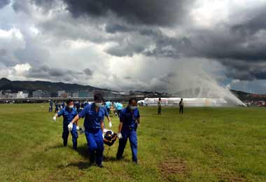 航空器事故救難演練,救難人員搶救模擬失事客機(jī)乘客。 “中央社”圖