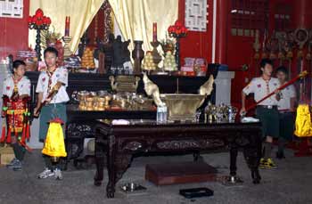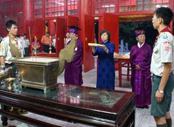 中新網(wǎng)9月28日電 08年嘉義市各界紀(jì)念大成至圣先師誕辰釋奠典禮今天上午如期在嘉義公園內(nèi)孔廟舉行。因薔薇臺(tái)風(fēng)來(lái)襲,顧及學(xué)生安全,今年首度取消佾舞,并創(chuàng)下由童軍擔(dān)任禮生的先例。不少民眾和小朋友冒著風(fēng)雨到場(chǎng)觀禮,并在祀典后領(lǐng)取智能糕,期能增長(zhǎng)智能、學(xué)業(yè)進(jìn)步。