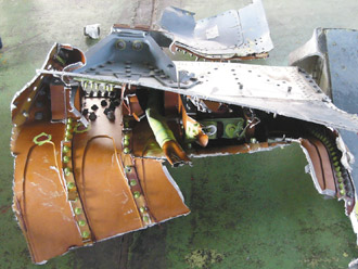 空軍編號一六一五IDF雙座戰(zhàn)機,前天上午飛到澎湖草嶼石礁靶場炸射時失聯(lián),兩名飛行員失蹤。軍方昨天撈獲疑似IDF左、右襟副翼及零組件、高壓氣瓶、機炮自動馬達及發(fā)動機下方掛點等殘骸,不是斷裂就是嚴重扭曲,未見爆炸痕跡,軍方分析“戰(zhàn)機撞擊海面造成”。