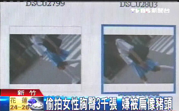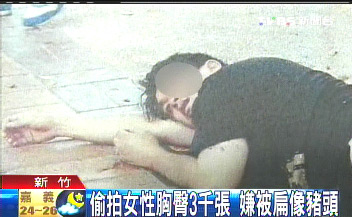 坐在警局里的林姓嫌犯,臉上包著一大塊紗布,警方說他臉腫到像豬頭,因?yàn)樗嫦釉谛轮袷袌?chǎng)里,拿手機(jī)偷拍女性胸部和臀部,今天再度犯案的時(shí)候,當(dāng)場(chǎng)被市場(chǎng)攤販逮個(gè)正著,整個(gè)人被打到癱在地上,左眼縫了2針,臉腫得連家人都認(rèn)不出來。
