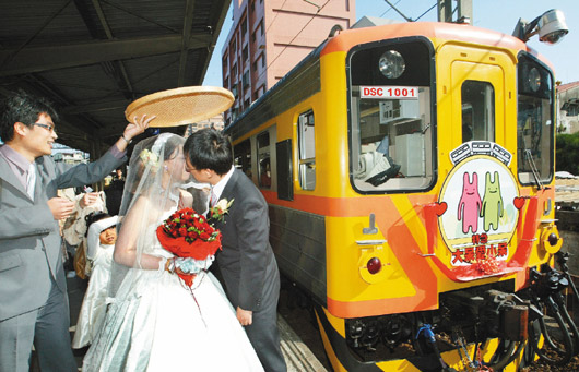 結(jié)婚禮車特別在臺(tái)中縣追分站停下來,讓新人拍照,“追求婚姻得滿分!”賓客們高聲送上祝福。