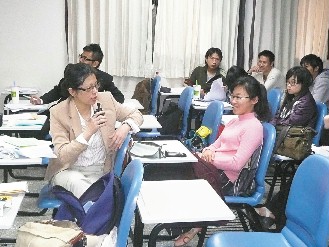 臺(tái)灣靜宜大傳系助理教授陳明媚(左)在“色情片分析“課堂上,與學(xué)生溝通,內(nèi)容直接露骨。圖片來源:臺(tái)灣《聯(lián)合報(bào)》