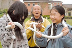 13歲的初中女生小玲,大膽地把白蛇放在脖子,還耀武揚(yáng)威對(duì)媽媽說(shuō):“你看,我很勇敢吧!”8歲的小二生小武抓著蛇頭到處嚇人。17歲高中生小芳,把白蛇當(dāng)圍巾套在脖子取暖。