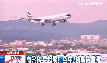 中新網(wǎng)3月1日電 據(jù)臺(tái)灣TVBS報(bào)道,臺(tái)北桃園機(jī)場去年6月才因跑道上有飛機(jī)要起飛,塔臺(tái)緊急通知正要降落的飛機(jī)重飛,驚險(xiǎn)事件在8個(gè)多月后又重演。27日,桃園機(jī)場跑道,一架飛機(jī)機(jī)頭超過跑道停止線,顯示正要起飛,塔臺(tái)緊急通知空中2架正要降落的飛機(jī)重飛,但其中國泰飛機(jī)機(jī)師因?yàn)槁牪欢形,不知發(fā)生什么事,最后塔臺(tái)又再度溝通,才及時(shí)重飛,有驚無險(xiǎn)。