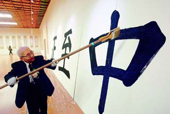 88歲的楊家麟原本想重現(xiàn)當年用木棍、鐵絲綁麻繩書寫大中至正的情景,但他昨天因關節(jié)炎舊疾發(fā)作、無力握筆,只好展出事先寫好的大字,象征性地比劃比劃讓記者拍照。