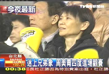 中新網(wǎng)4月3日電 據(jù)臺灣TVBS報(bào)道,馬英九夫人周美青最近迷上臺灣職業(yè)棒球,只要有她支持的兄弟象隊(duì)出賽,她都一定到場加油,但終場兄弟象還是輸了比賽,讓周美青好失望。