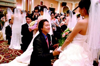 中新網(wǎng)4月16日電 據(jù)臺灣《聯(lián)合報》報道,花蓮縣15日在舉辦集體結(jié)婚,全縣100對新人完成終身大事,有日本郎娶臺灣美嬌娘,也有佛教醫(yī)院人員娶基督教醫(yī)院護士,新人在微微的細雨中走過許愿池,誓言情愛一生。