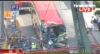臺北市消防局表示,下午1時(shí)54分松高路19號工地發(fā)生起重機(jī)吊臂掉落,砸中1輛停在路旁、載著25名大陸游客的游覽車尾端,目前傷者已經(jīng)送醫(yī)急救。
