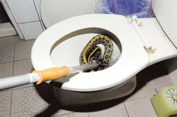 中新網(wǎng)5月11日電 一朝被蛇咬,十年怕馬桶?據(jù)臺灣《中國時報》報道,住南投埔里鎮(zhèn)山區(qū)的林姓男子,日前坐馬桶小解時,突感下體一陣劇痛,回頭赫見一條巨蛇躲在馬桶里昂首吐舌信,咬破他的陰囊鮮血直流,趕緊負傷求助鄰人送醫(yī);醫(yī)生說所幸黑眉錦蛇無毒,否則連小命也不保。
