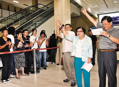 許榮淑踏進(jìn)入境大廳,立刻有掌聲為她加油,三重市黨部動(dòng)員許多民眾接機(jī),可是仔細(xì)一看,這一整群的支持者還真有殺氣,穿著打扮不是黑就是白,即使在室內(nèi)也要戴墨鏡,就像在拍香港古惑仔的電影,身上的刺青格外引人注目,唯一跟港版古惑仔不同的是,臺(tái)灣的熱血男兒們嚼著檳榔。這些支持者不但搭4輛游覽車來(lái)相挺,還帶著打扮清涼火辣的辣妹一同觀摩政治人物如何造勢(shì)。