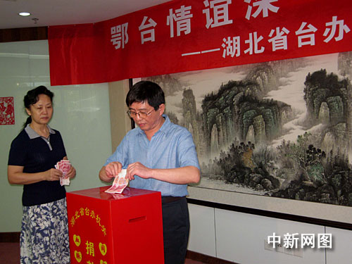 連日來(lái),臺(tái)灣災(zāi)情牽動(dòng)著大陸同胞的心,各界紛紛伸出援手。8月20日下午,湖北省臺(tái)辦舉行向臺(tái)灣災(zāi)區(qū)捐款儀式,省臺(tái)辦機(jī)關(guān)捐出20萬(wàn)元人民幣,省臺(tái)辦機(jī)關(guān)工作人員現(xiàn)場(chǎng)捐款1.4萬(wàn)元。截至20日下午,湖北各界對(duì)臺(tái)灣災(zāi)區(qū)捐款已近2000萬(wàn)元人民幣。